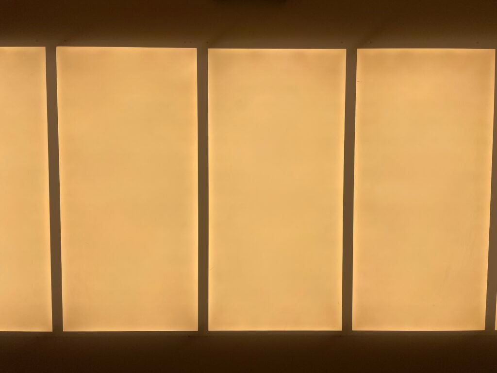 Un pasillo revestido con paneles que irradian una cálida luminosidad, creando un ambiente acogedor a pesar de la tenue iluminación general. La luz suave se desliza a lo largo de las paredes, acentuando las texturas y generando un contraste armonioso con las sombras que envuelven el entorno, invitando a avanzar con una sensación de calma y serenidad.
