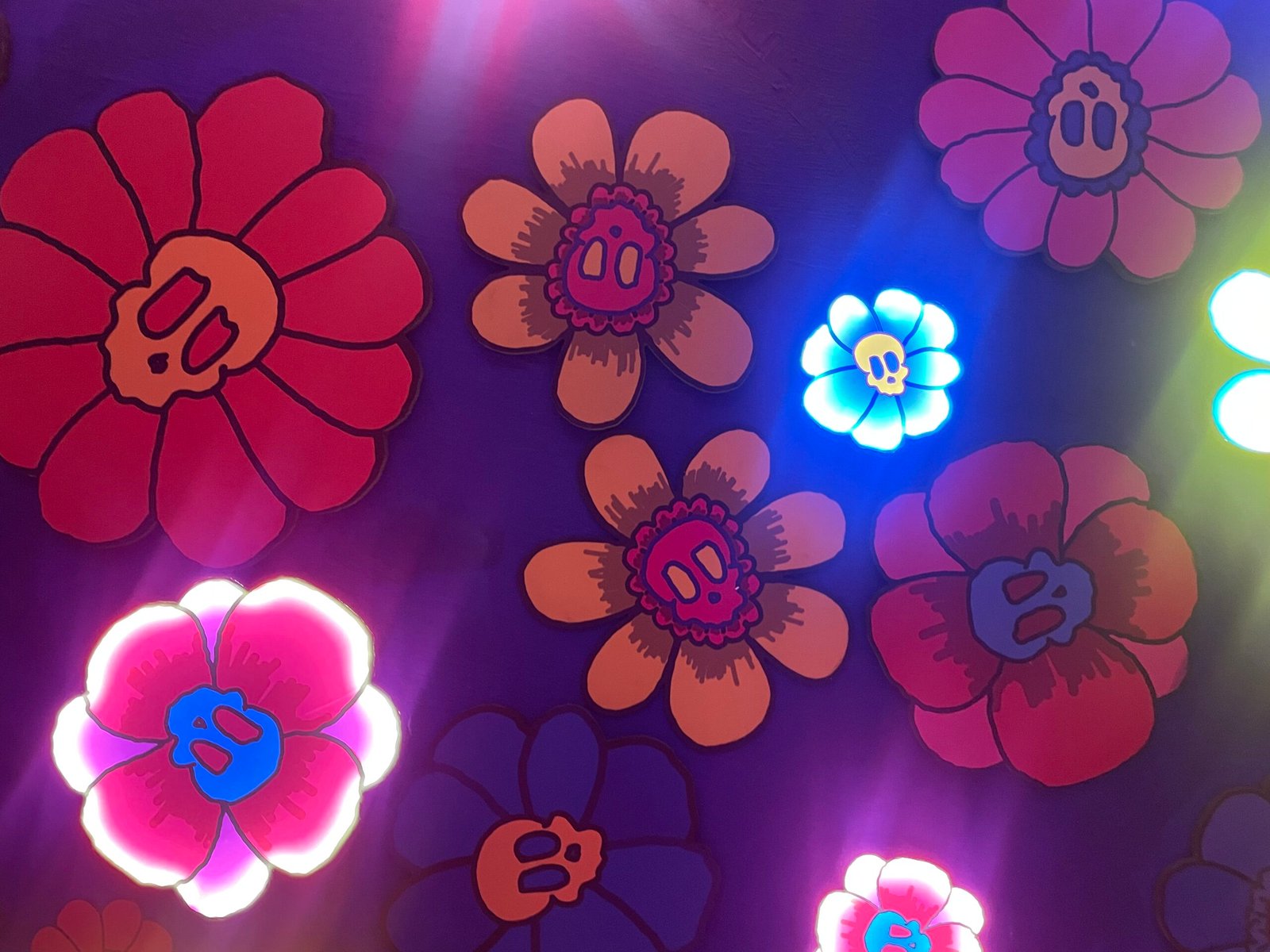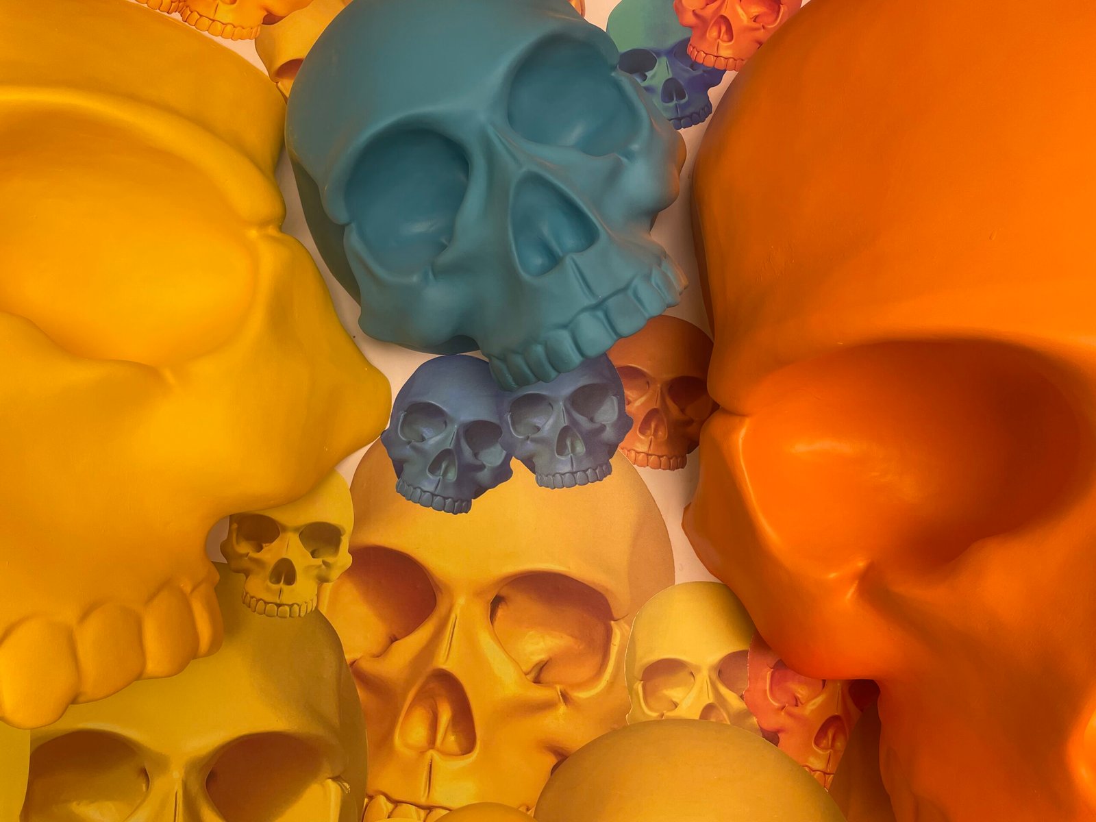 Una habitación cuyas paredes están cubiertas de calaveras de colores, dispuestas tanto en ilustraciones bidimensionales como en esculturas tridimensionales. Los tonos vibrantes destacan sobre el fondo y generan un contraste dinámico, mientras las figuras en relieve proyectan sombras que dan profundidad al espacio. El conjunto crea una atmósfera entre lo artístico y lo ritual, donde cada calavera aporta su propia expresión y convierte la estancia en un escenario lleno de simbolismo y vitalidad.