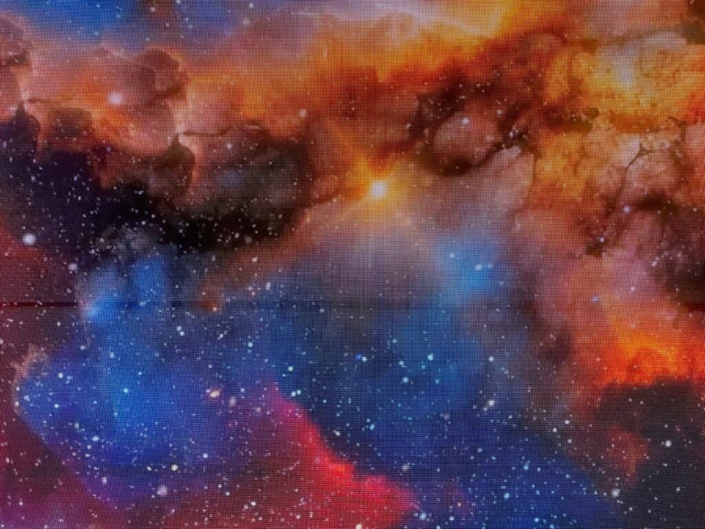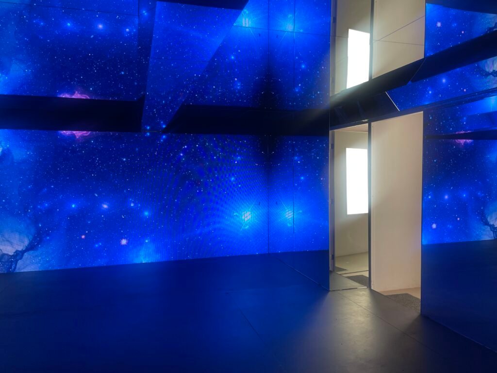 Una habitación recubierta de espejos y rodeada de pantallas envolventes que, al sincronizarse, crean la ilusión de viajar a través del cosmos. Las superficies reflectantes multiplican las imágenes de nebulosas, estrellas y galaxias lejanas, expandiendo el espacio hasta hacerlo parecer infinito. Cada destello luminoso y cada movimiento en las pantallas transforma el entorno en un escenario celestial que invita a perderse en la inmensidad del universo.